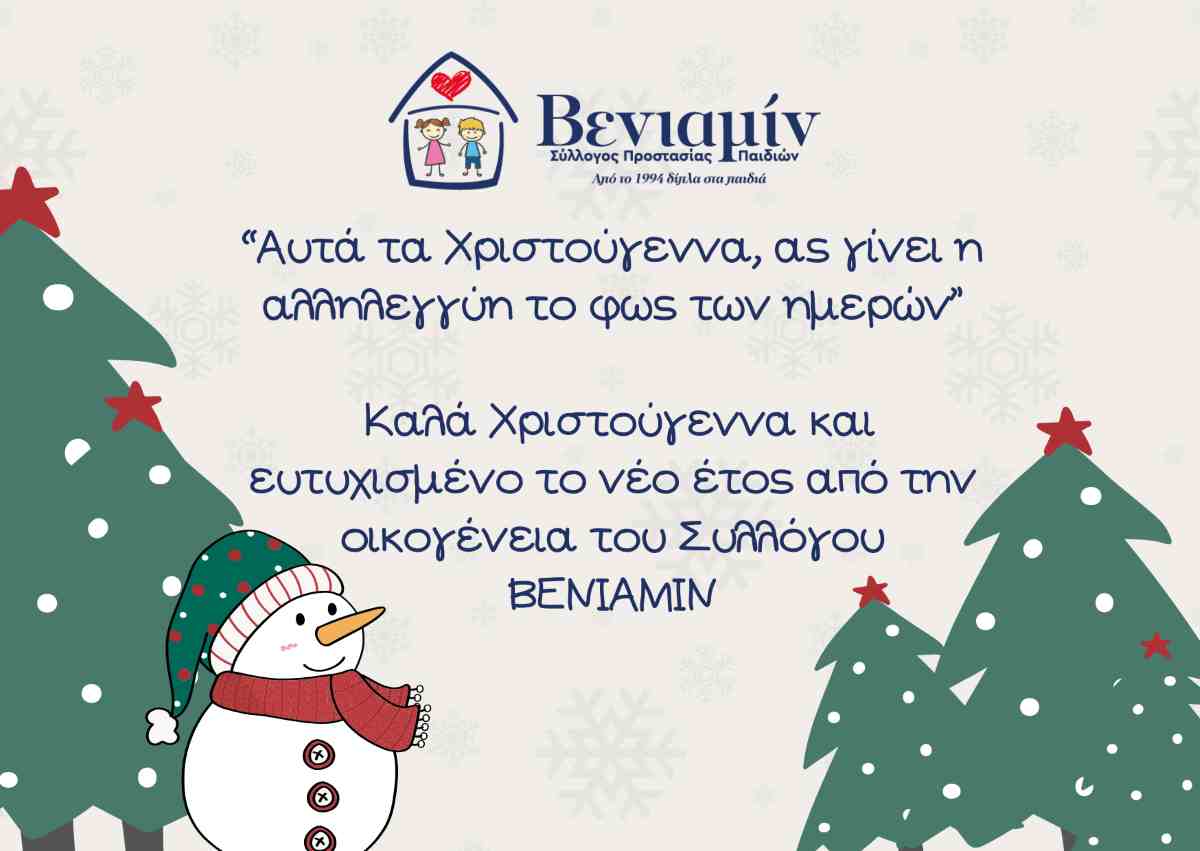 Το Διοικητικό Συμβούλιο, οι εθελοντές, οι εργαζόμενοι, οι υποστηριζόμενες οικογένειες και τα παιδιά του Συλλόγου ΒΕΝΙΑΜΙΝ, σας αποστέλλουμε τις θερμότερες ευχές μας για υγεία, αγάπη και ευημερία. Είθε το πνεύμα των Χριστουγέννων να φωτίζει τις καρδιές σας.