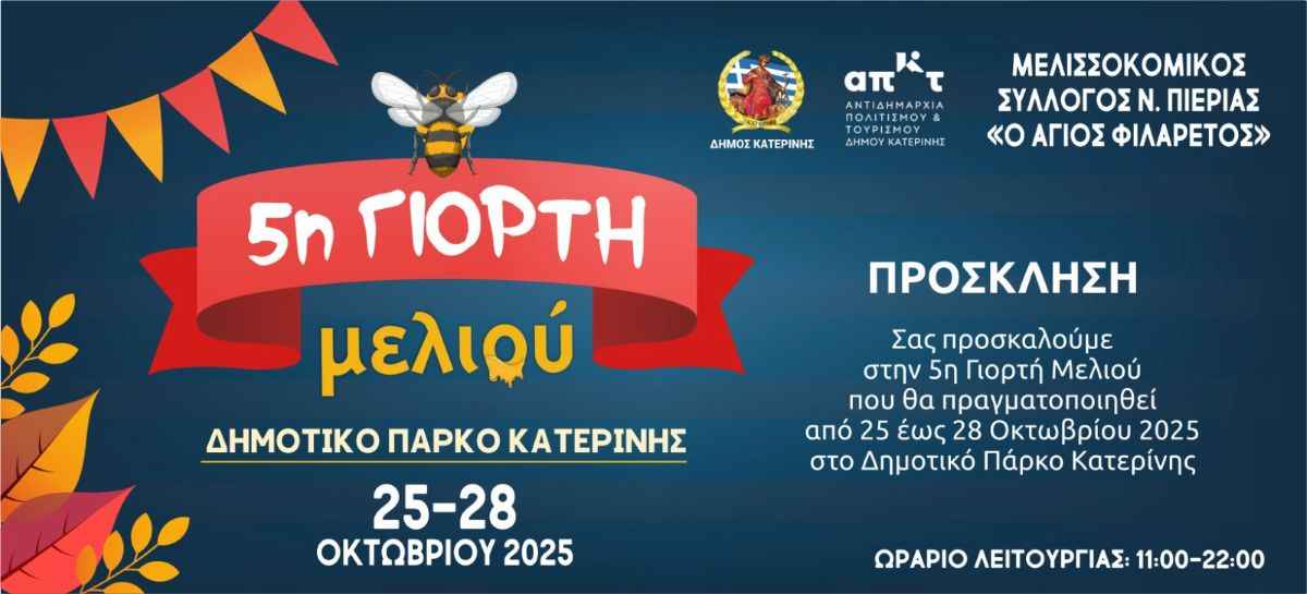 Ο Μελισσοκομικός Σύλλογος Πιερίας και ο Δήμος Κατερίνης ενώνουν και φέτος τις δυνάμεις τους, διοργανώνοντας την 5η Γιορτή Μελιού Πιερίας, από Σάββατο 25 έως Τρίτη 28 Οκτωβρίου 2025, στο Δημοτικό Πάρκο Κατερίνης.