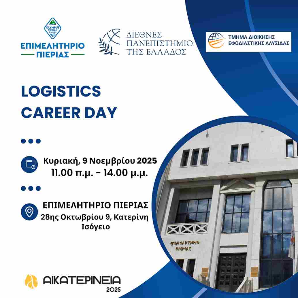 Το Επιμελητήριο Πιερίας και το Τμήμα Διοίκησης Εφοδιαστικής Αλυσίδας του Διεθνούς Πανεπιστημίου της Ελλάδος, συνδιοργανώνουν την εκδήλωση «Logistics Career Day», στο πλαίσιο των «Αικατερινείων 2025». Πρόκειται για μια πρωτοβουλία που αφορά τη σύνδεση της εκπαίδευσης με την αγορά εργασίας και την ενίσχυση των προοπτικών απασχόλησης στον κλάδο της Εφοδιαστικής Αλυσίδας.